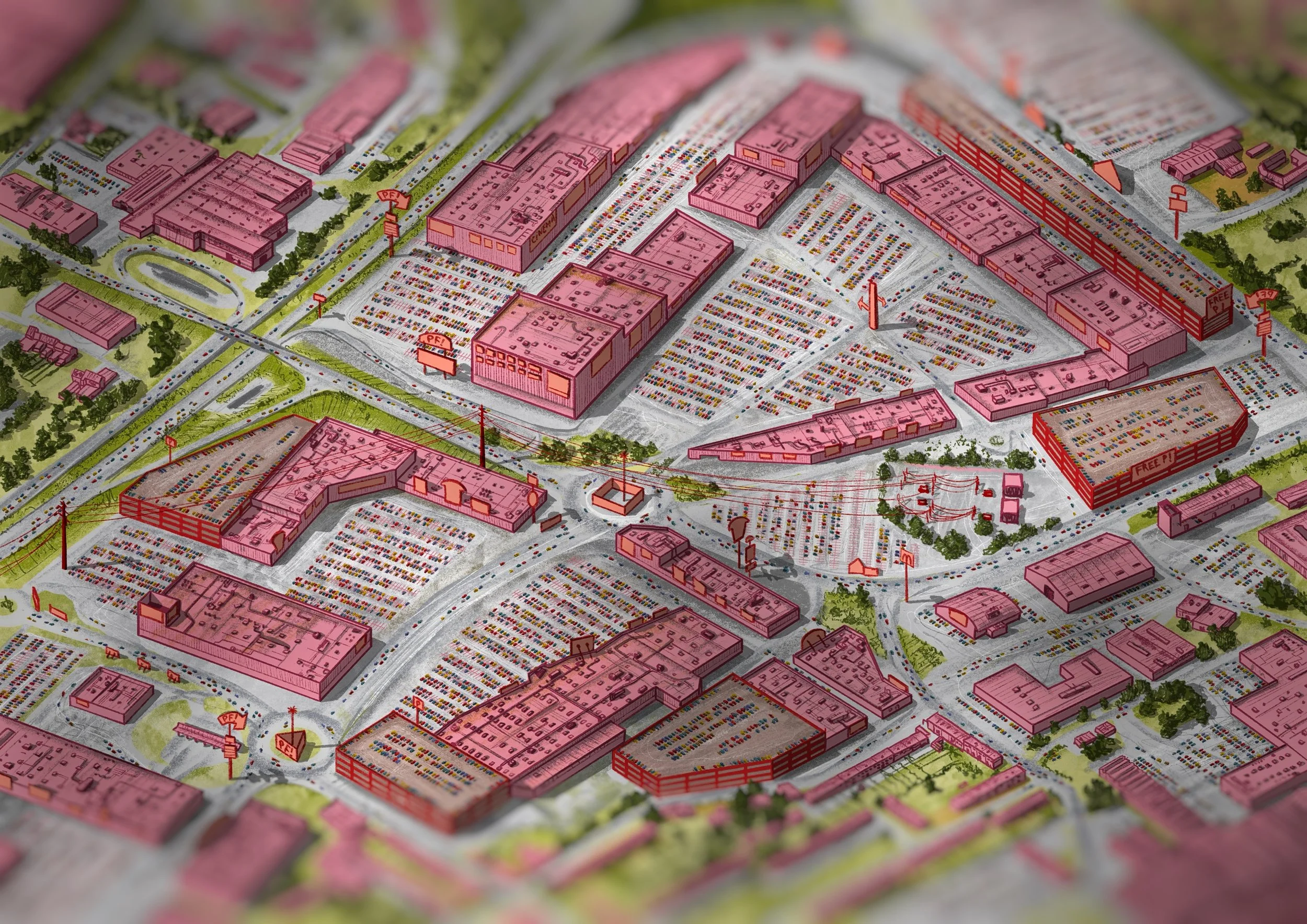À première vue, le sujet ne semble pas vraiment passionnant… Mais croyez-le ou non, il le devient lorsque l’on s’amuse à imaginer pour ces lieux un avenir complètement différent : Non plus celui d’immenses temples de la consommation, dépendants de la voiture et symboles de l’étalement urbain, mais celui de lieux vivants et résilients (oui, c’est possible).