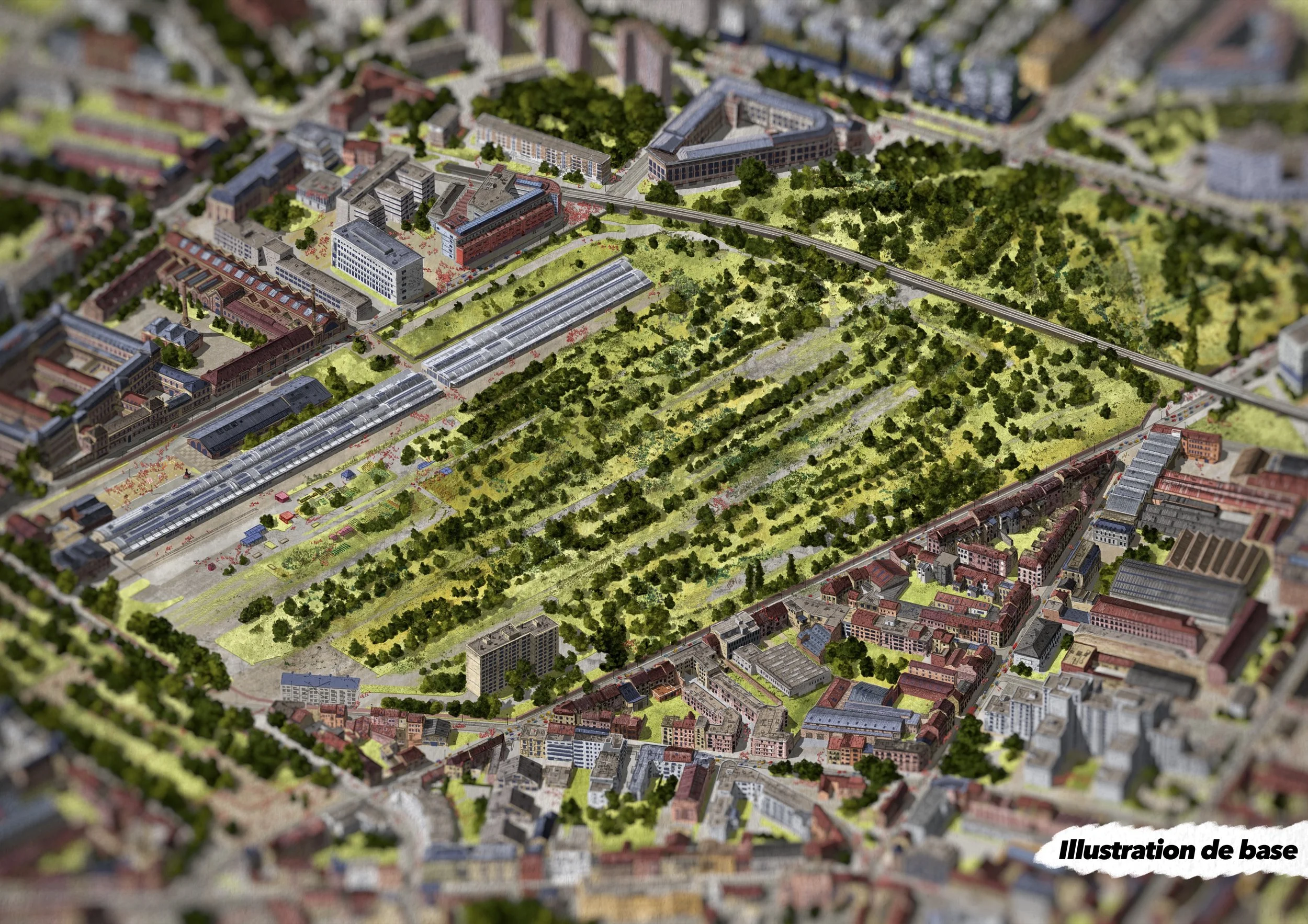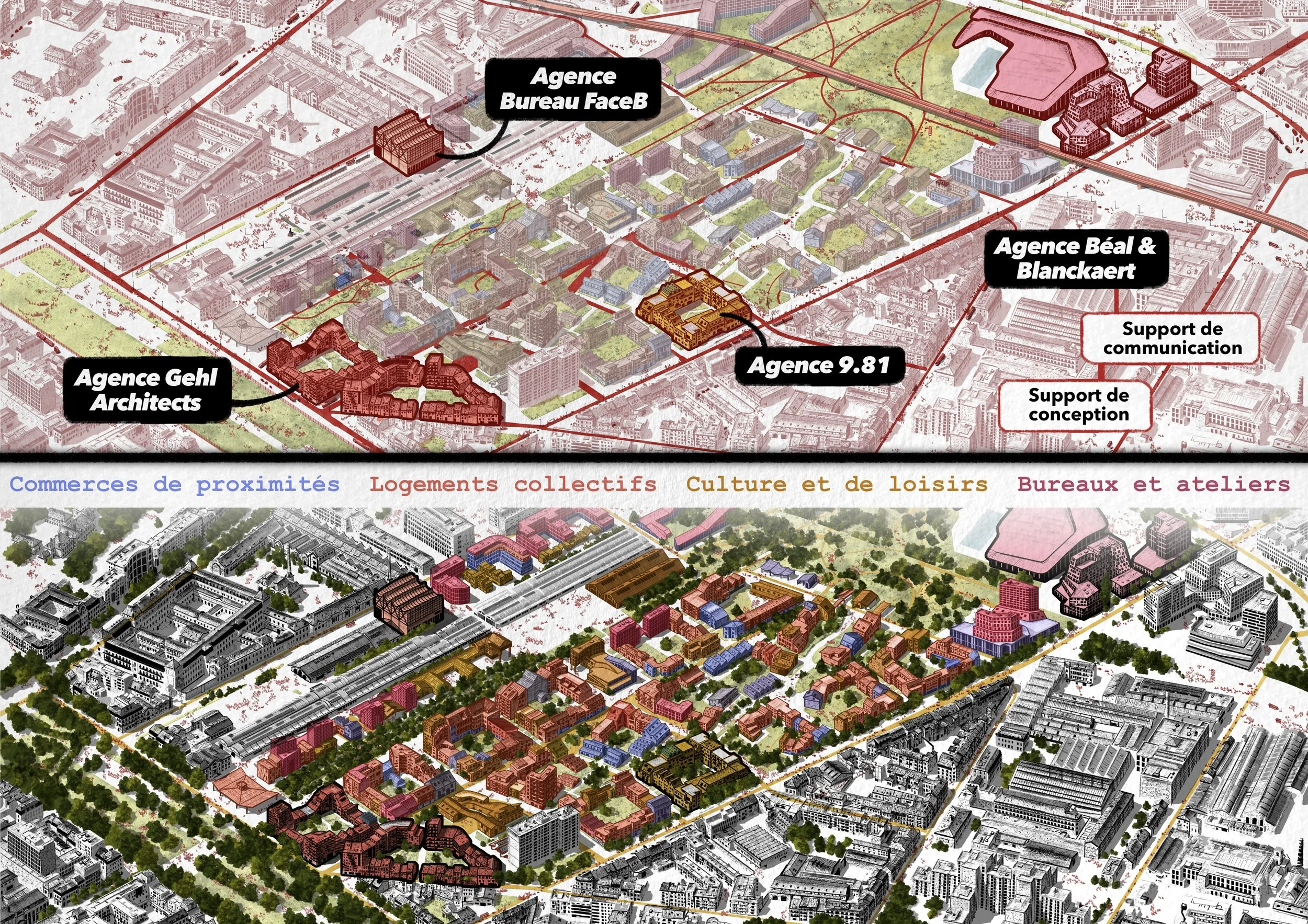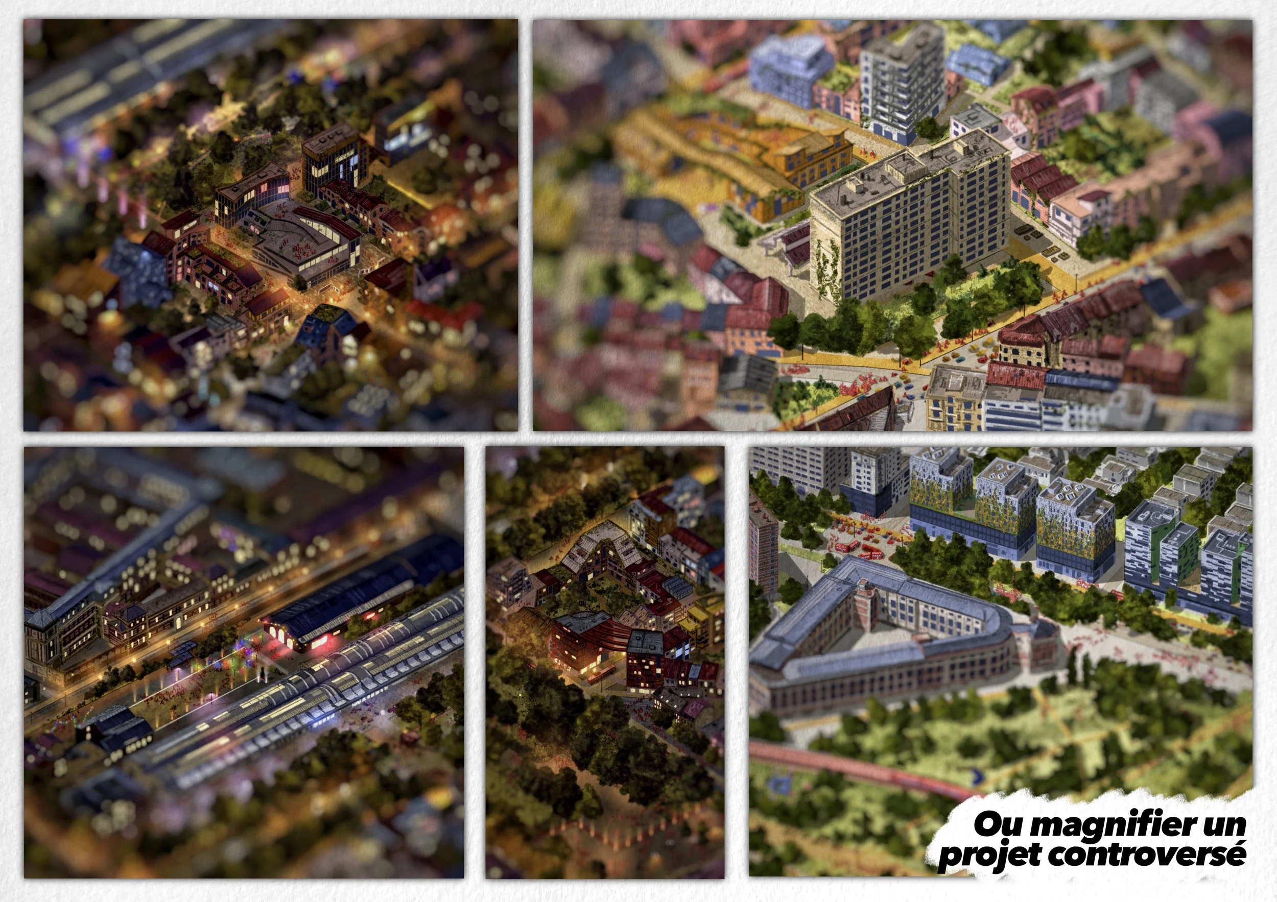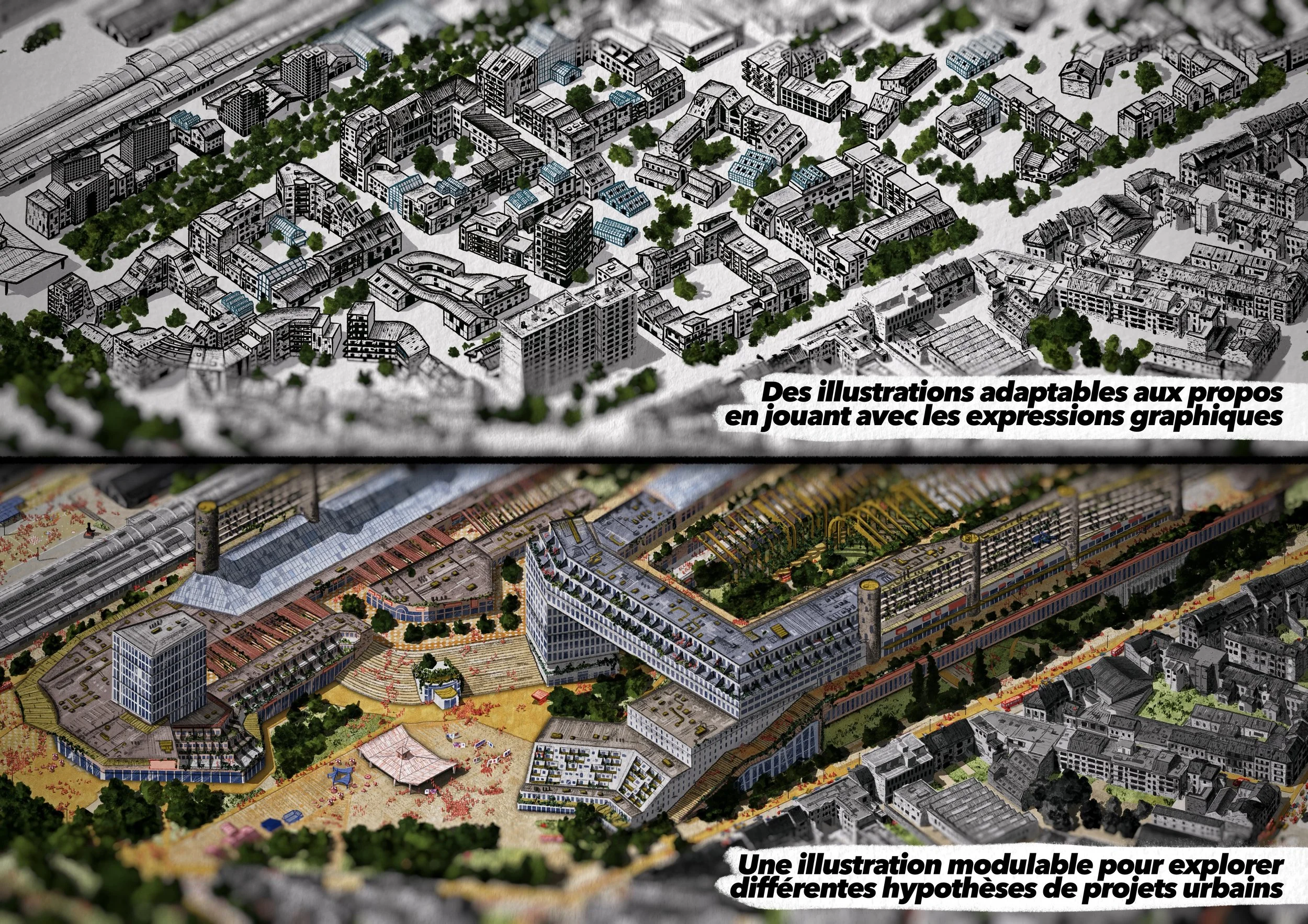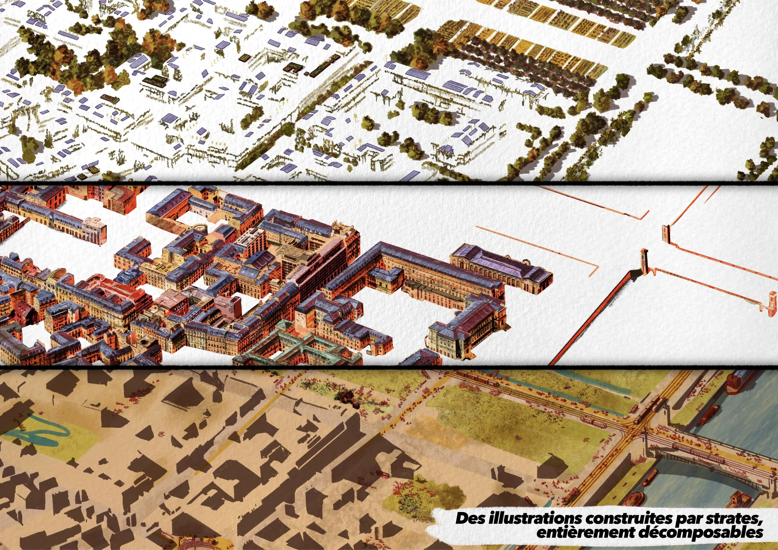 Il s’agit d’une vue axonométrique très détaillée, pouvant couvrir jusqu’à l’ensemble d’une commune. Elle sert de base illustrée pour explorer une multitude de scénarios urbains — qu’ils soient utopiques, dystopiques, réels ou imaginaires. Le dessin devient alors un outil puissant et évolutif, porté par une expression graphique unique, exploitable pour tout un tas d’acteurs…