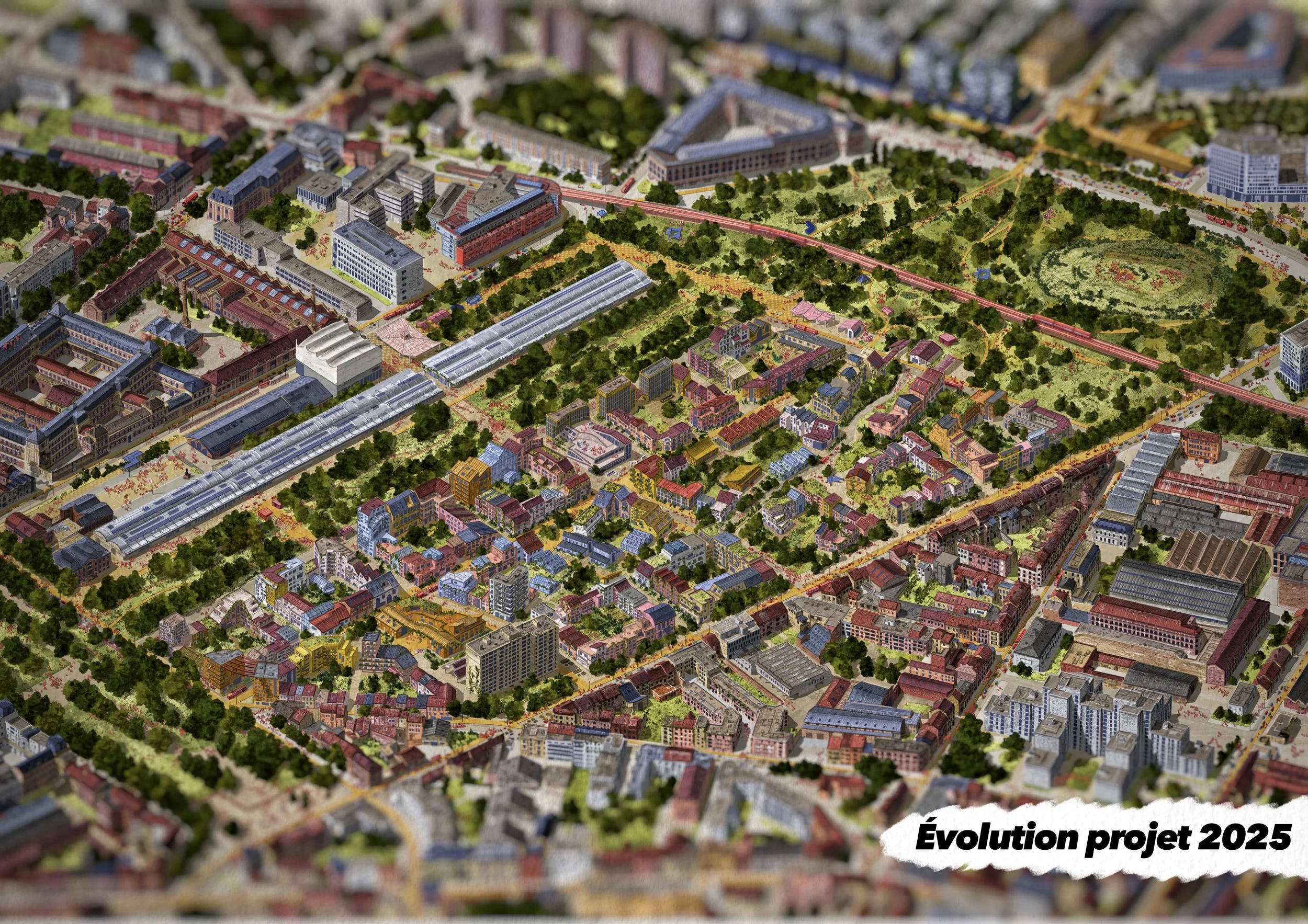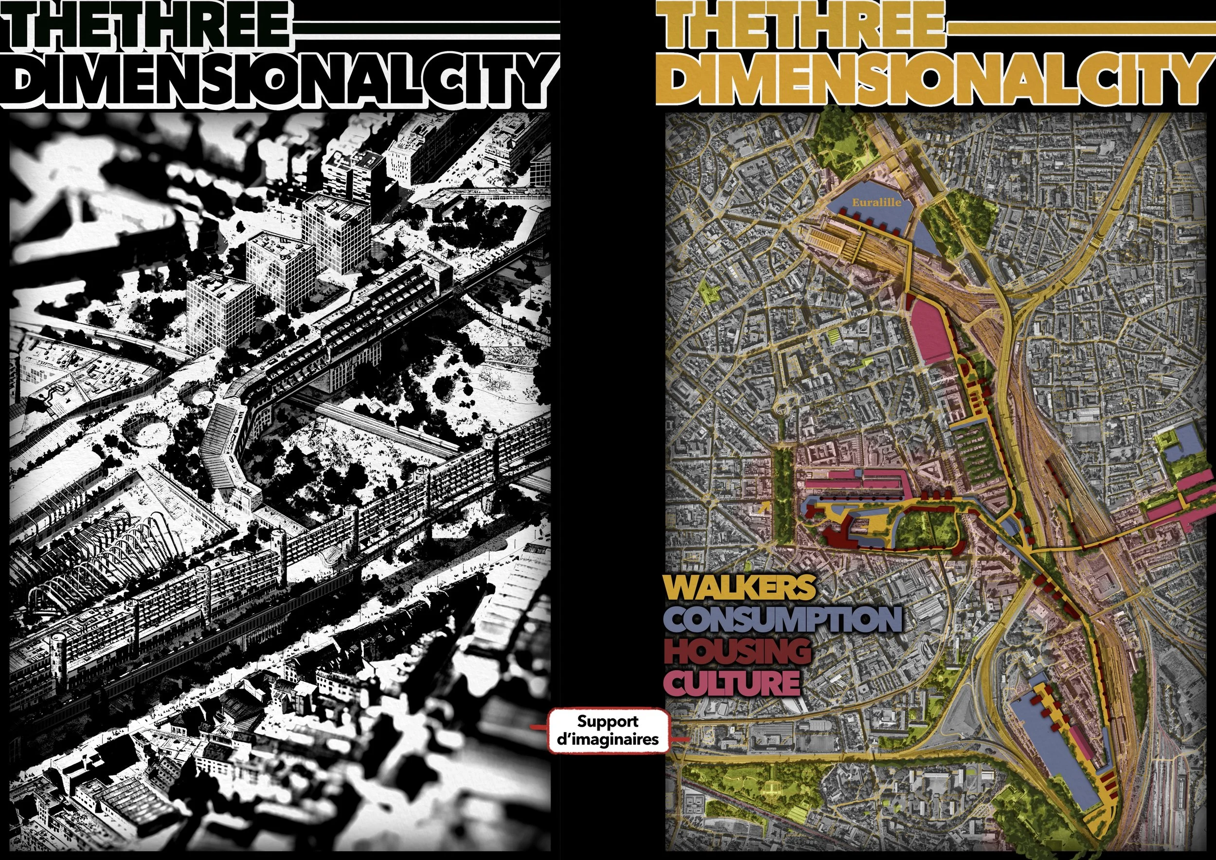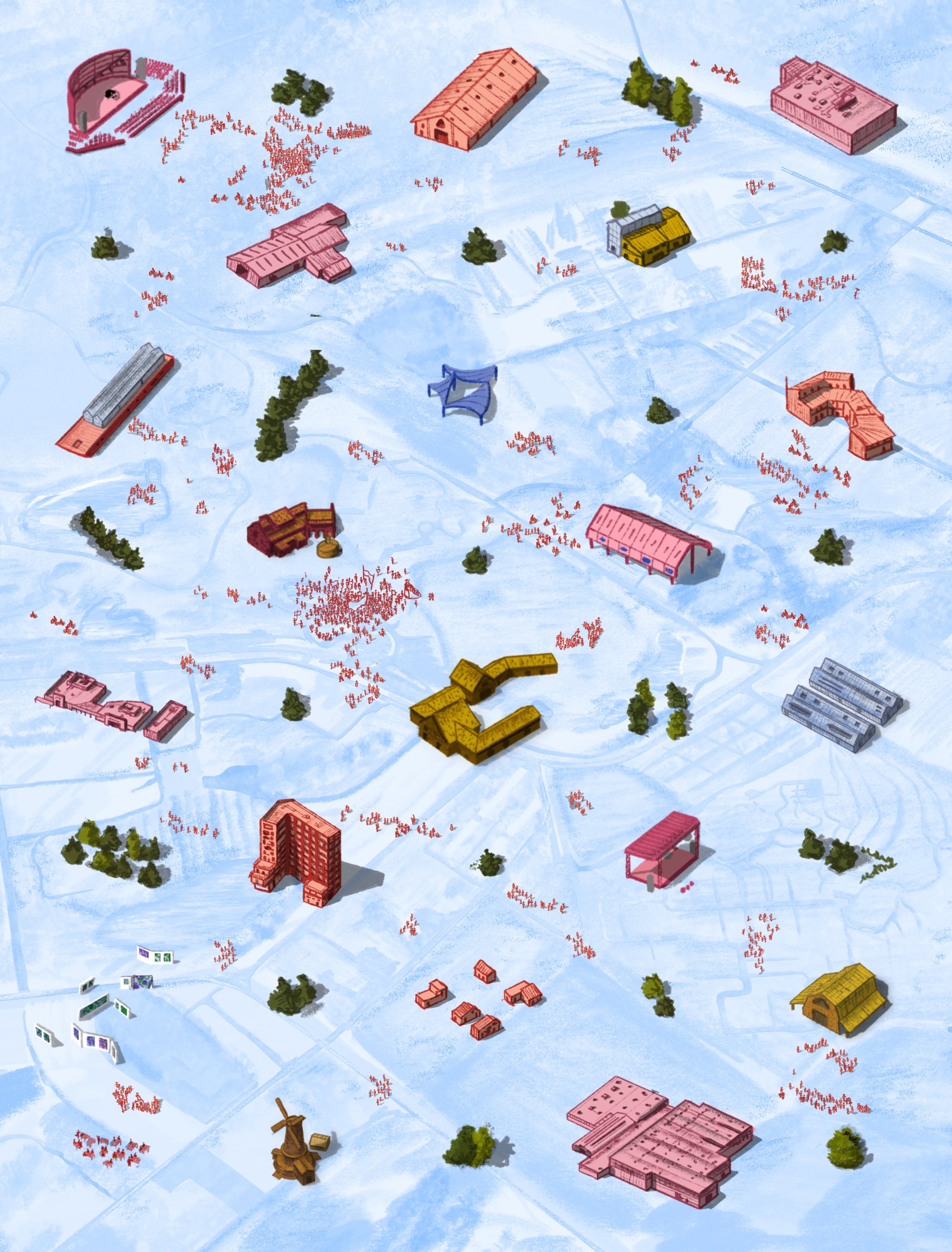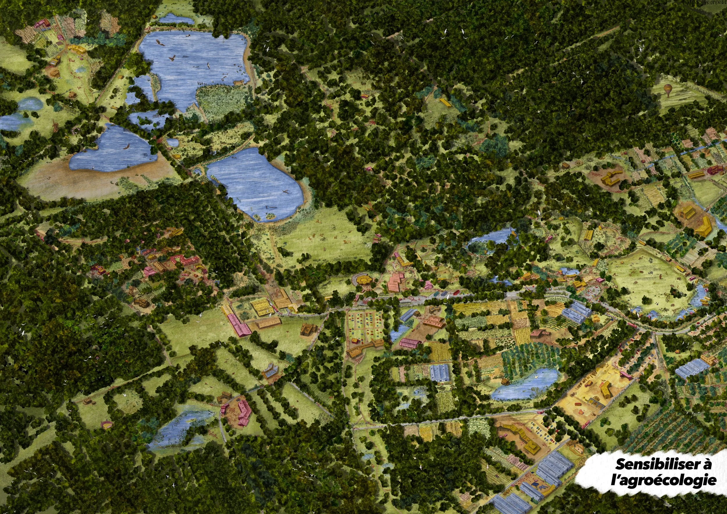 Il s’agit d’une vue axonométrique très détaillée, pouvant couvrir jusqu’à l’ensemble d’une commune. Elle sert de base illustrée pour explorer une multitude de scénarios urbains — qu’ils soient utopiques, dystopiques, réels ou imaginaires. Le dessin devient alors un outil puissant et évolutif, porté par une expression graphique unique, exploitable pour tout un tas d’acteurs…
