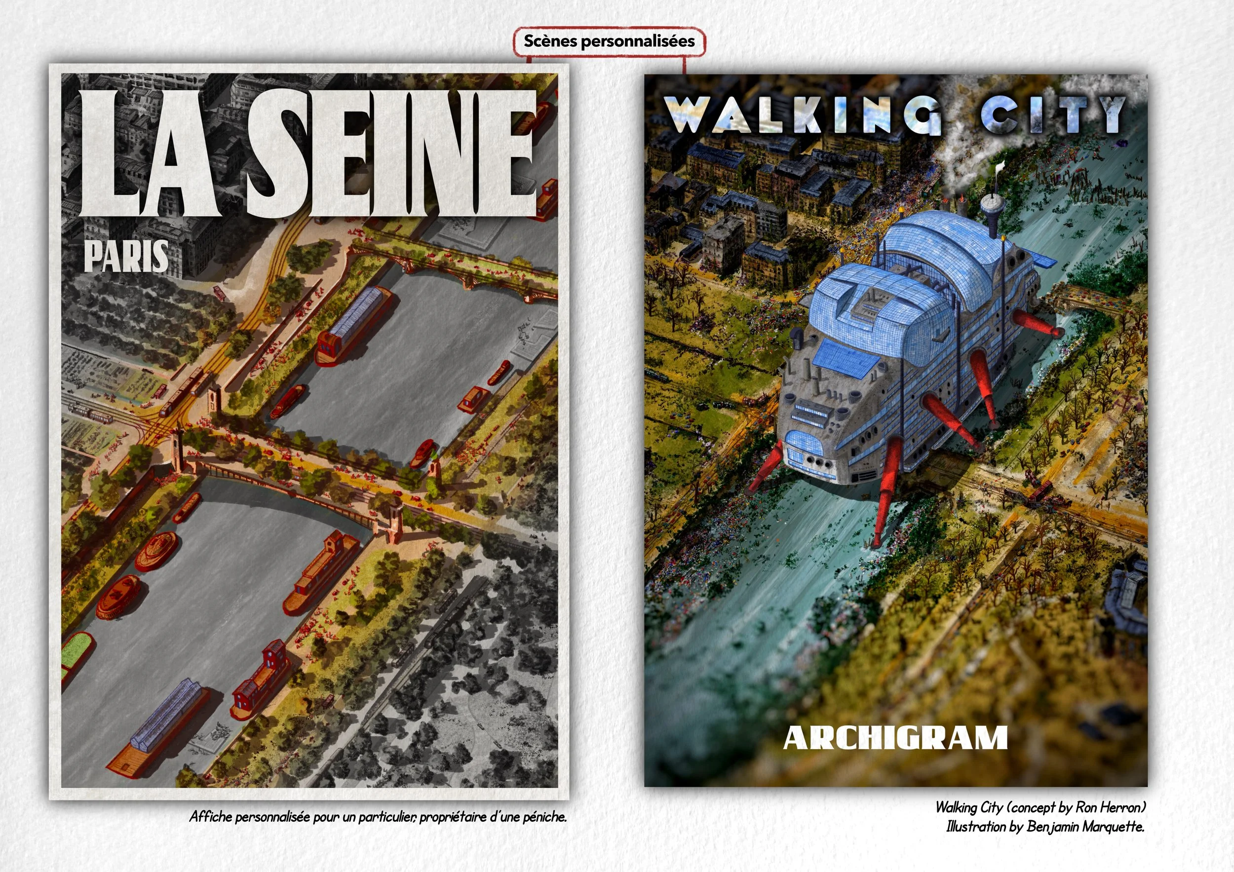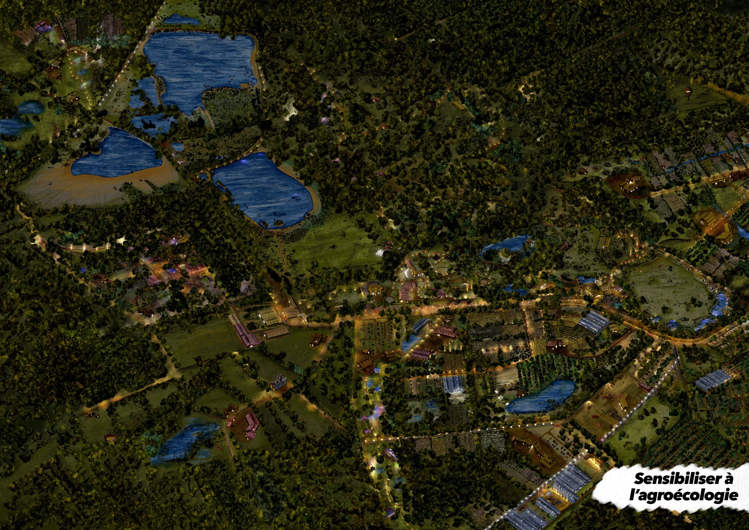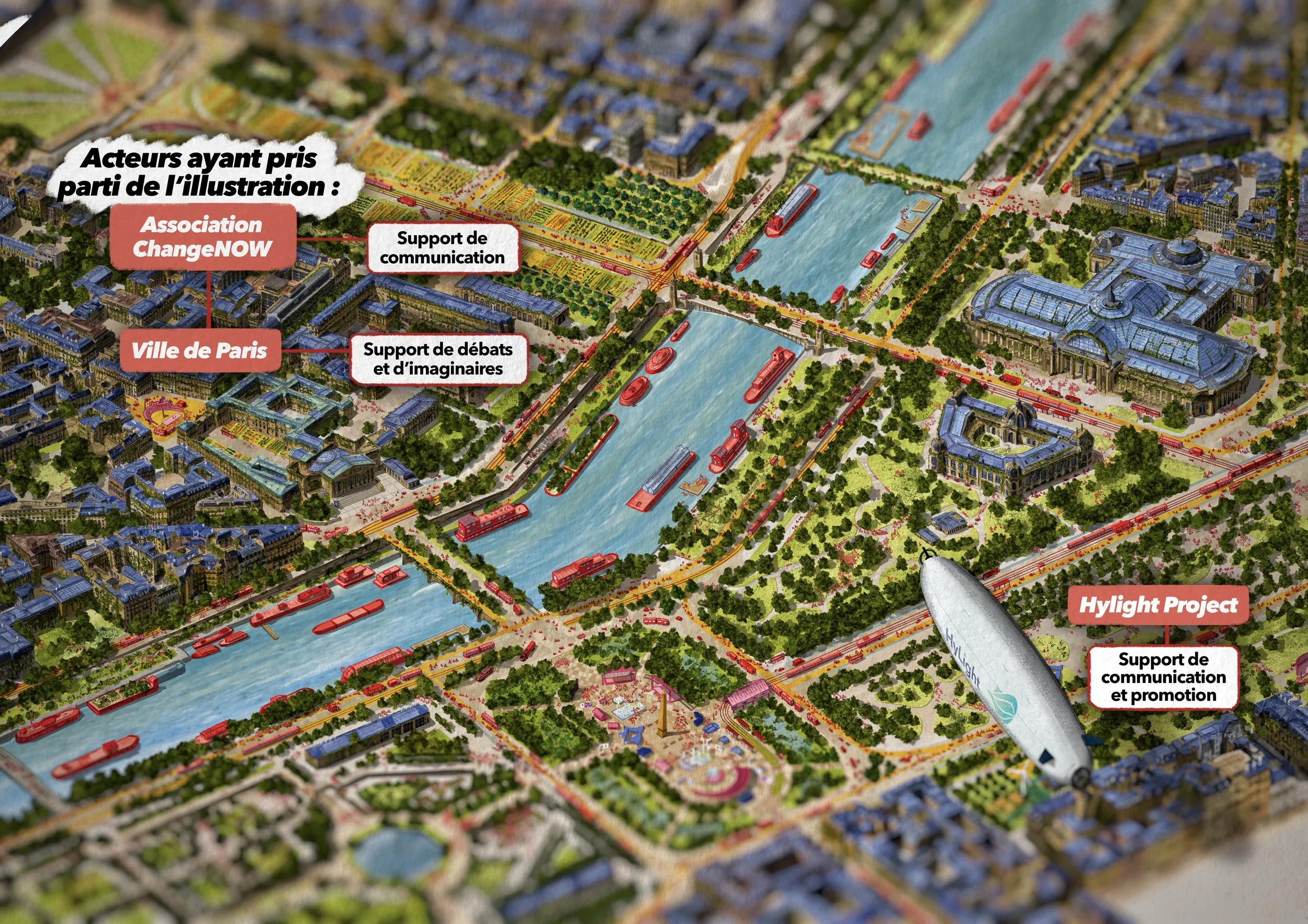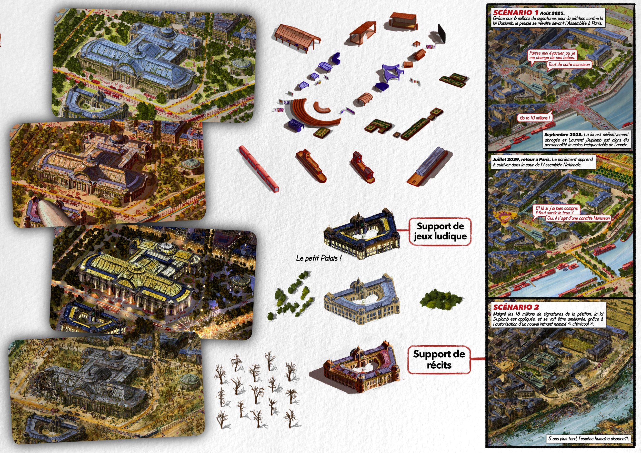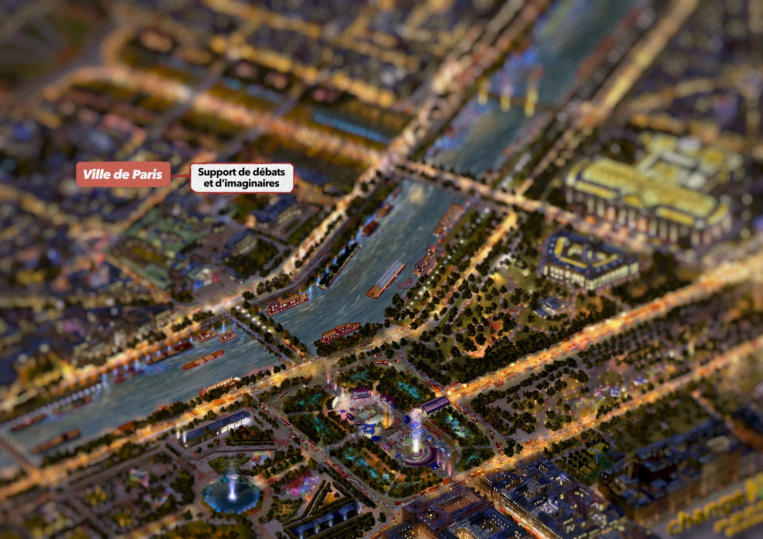 Il s’agit d’une vue axonométrique très détaillée, pouvant couvrir jusqu’à l’ensemble d’une commune. Elle sert de base illustrée pour explorer une multitude de scénarios urbains — qu’ils soient utopiques, dystopiques, réels ou imaginaires. Le dessin devient alors un outil puissant et évolutif, porté par une expression graphique unique, exploitable pour tout un tas d’acteurs…