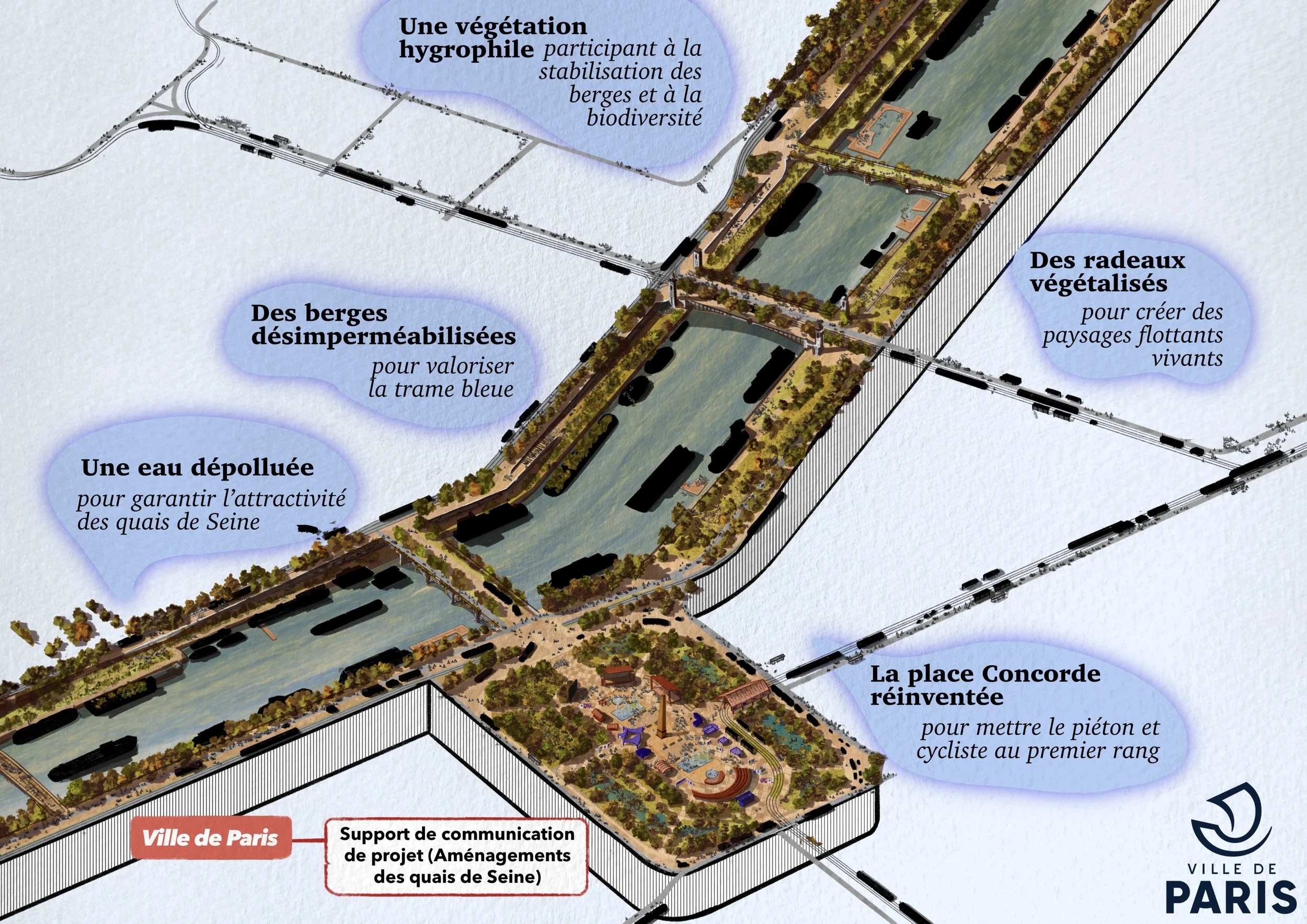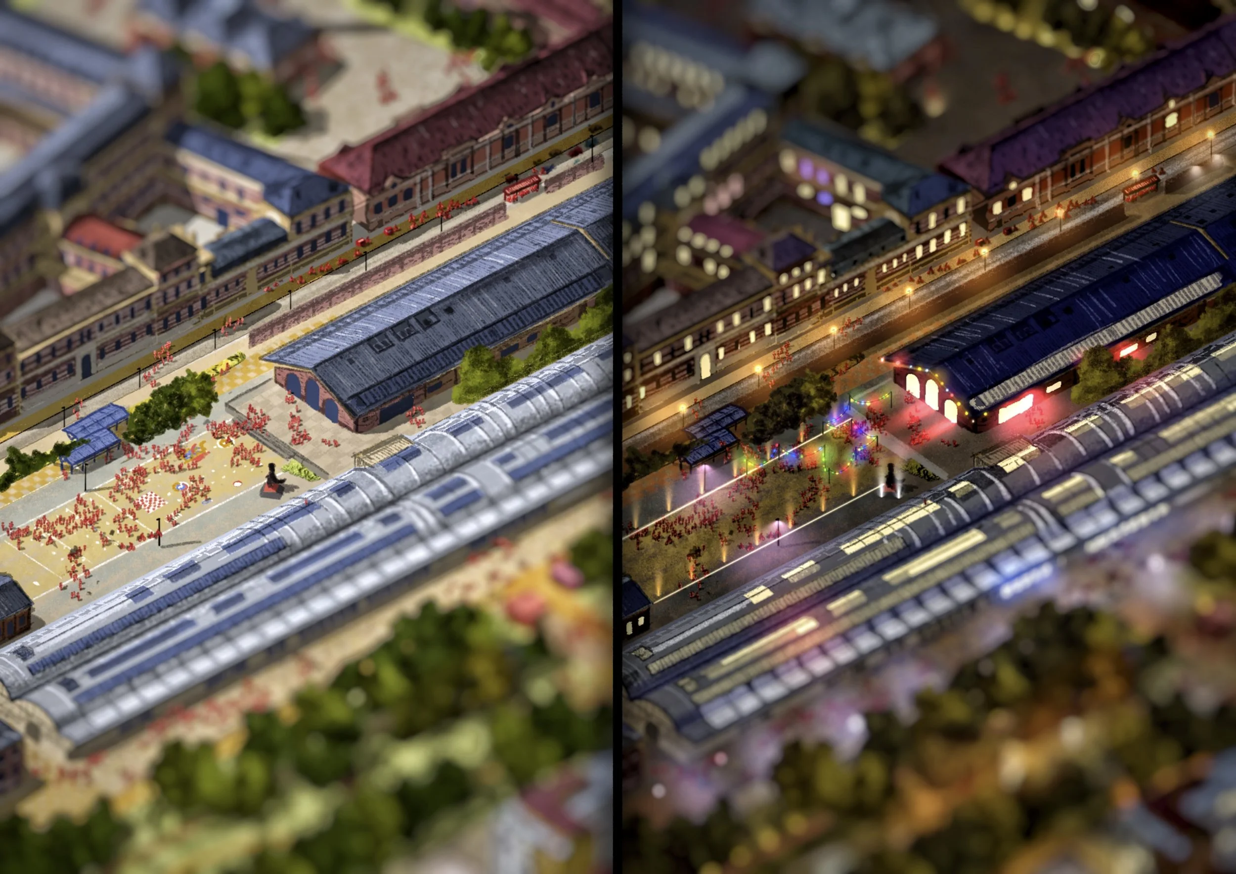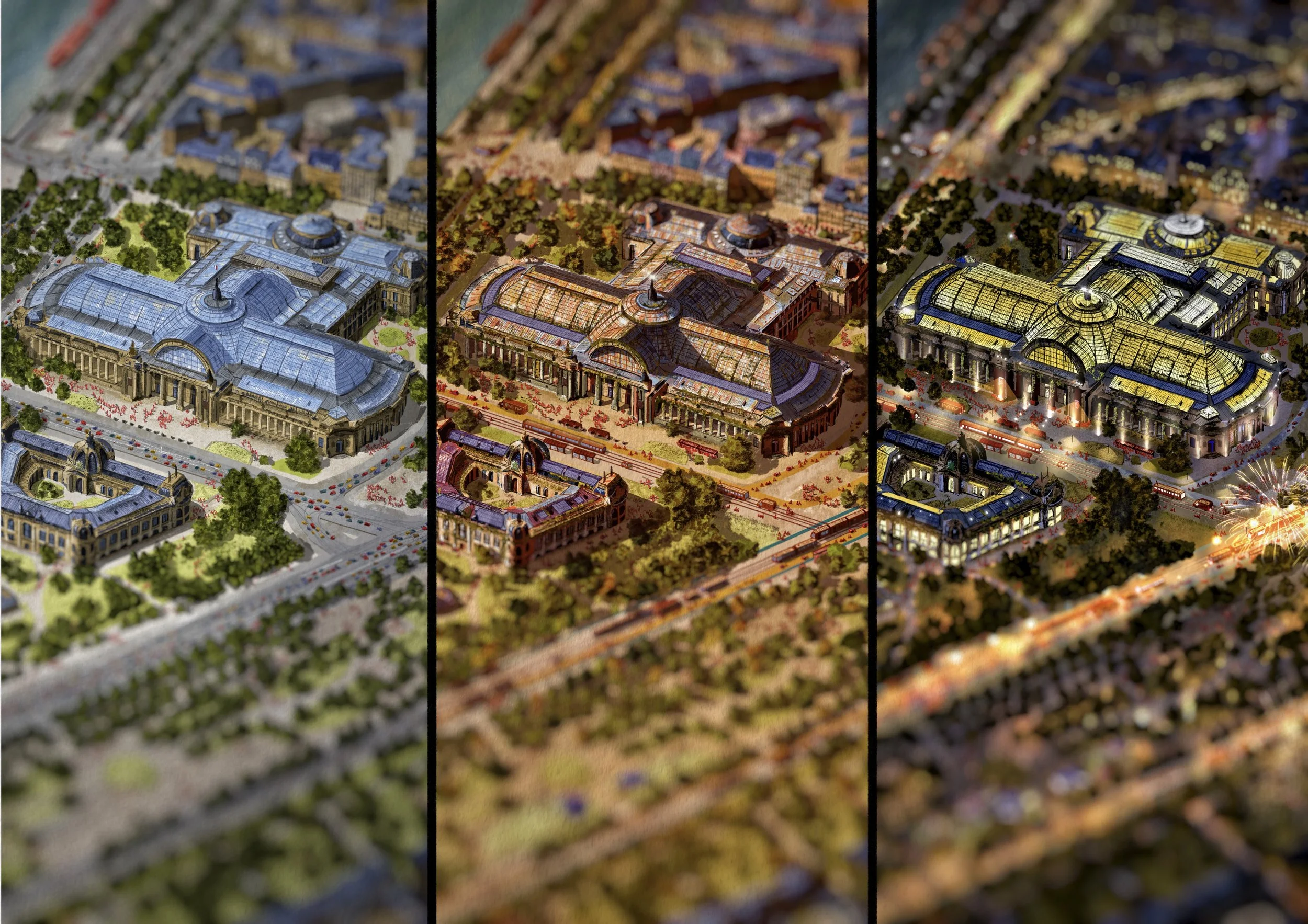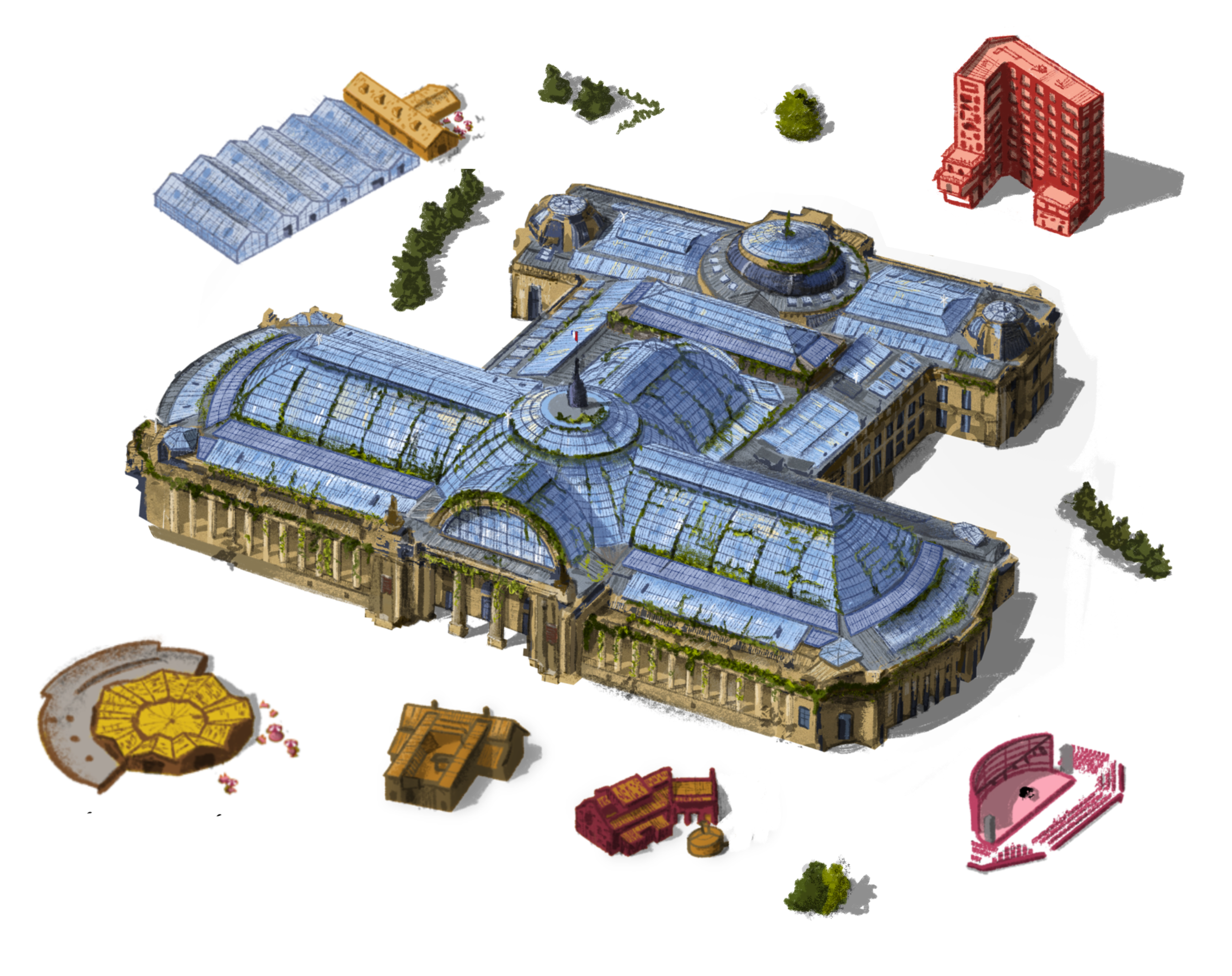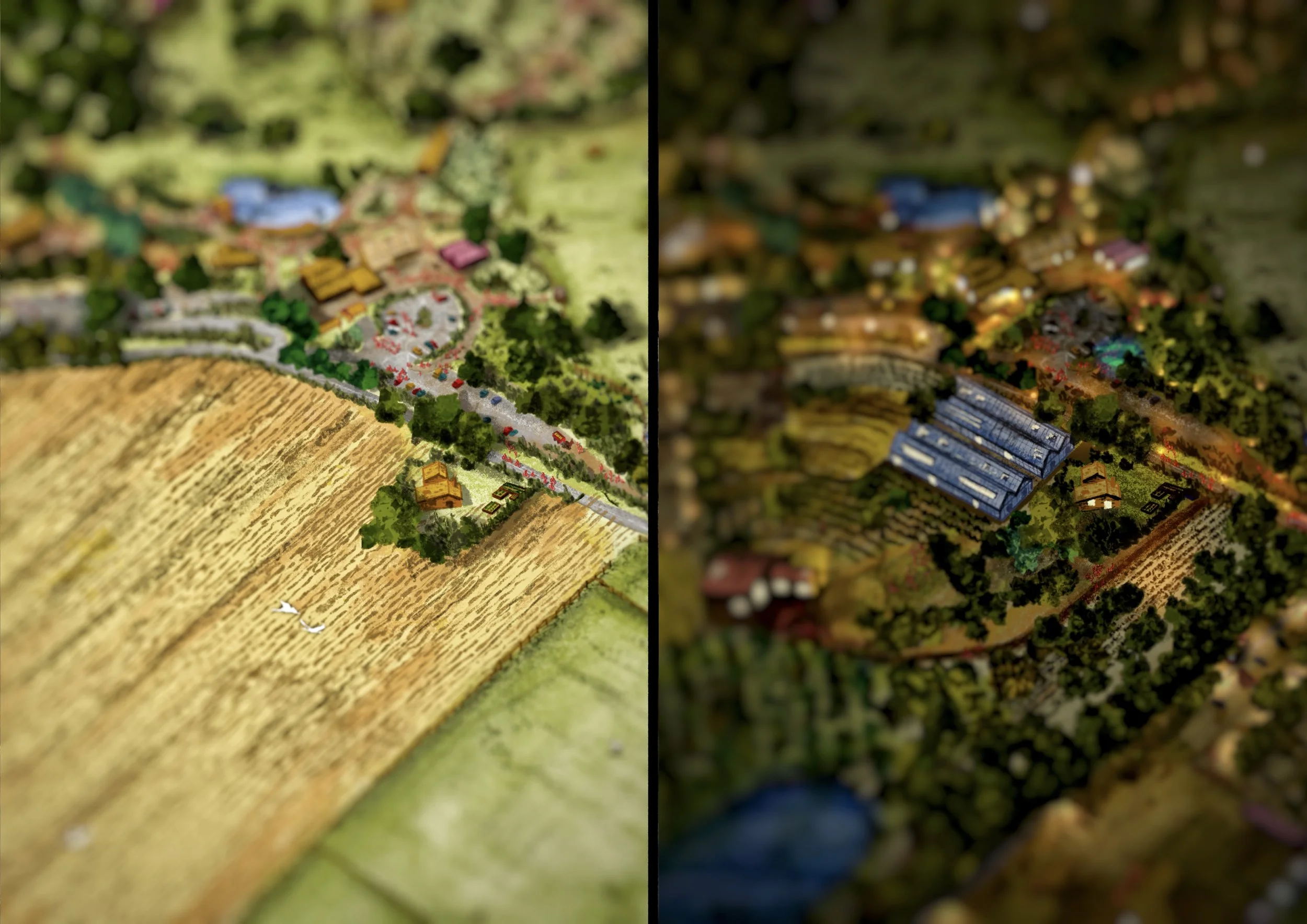 Il s’agit d’une vue axonométrique très détaillée, pouvant couvrir jusqu’à l’ensemble d’une commune. Elle sert de base illustrée pour explorer une multitude de scénarios urbains — qu’ils soient utopiques, dystopiques, réels ou imaginaires. Le dessin devient alors un outil puissant et évolutif, porté par une expression graphique unique, exploitable pour tout un tas d’acteurs…